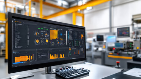 A close-up view of a modern computer monitor showcasing advanced data visualizations and metrics in a high-tech manufacturing environment, emphasizing automation and technology.