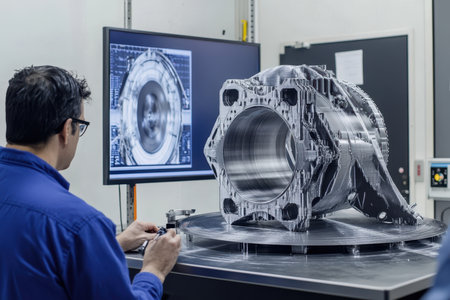 An engineer examines a precision model of a mechanical component on a 3D display in a workshop.