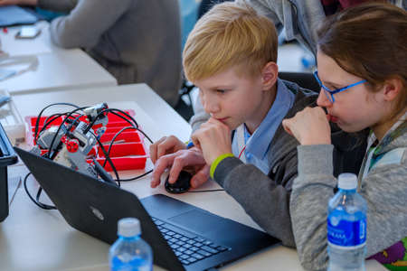 Moscow, Russia - April 24, 2018: Children learn how to program a robot at Skolkovo Robotics Forum