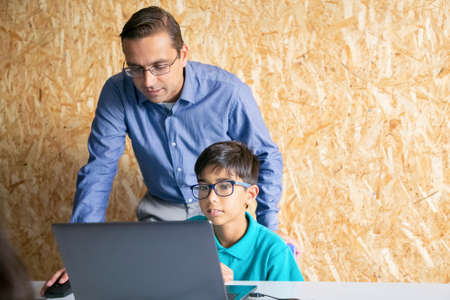 Middle-aged content teacher helping to boy with lesson and explaining theme. Young pupil in glasses looking at laptop computer screen and listening man. Childhood and digital education concept