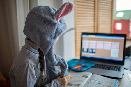 Distant education, online class meeting. Pretty schoolgirl wearing funny rabbit hat with ears to amuse classmates during boring online lesson at home, social distance during quarantine, self-isolation
