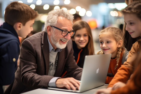 Senior teacher working on a laptop surrounded by students. Generative AI
