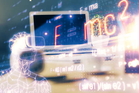 Desktop computer background and formula hologram writing. Double exposure. Education concept.
