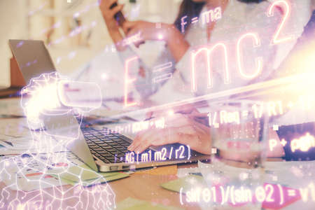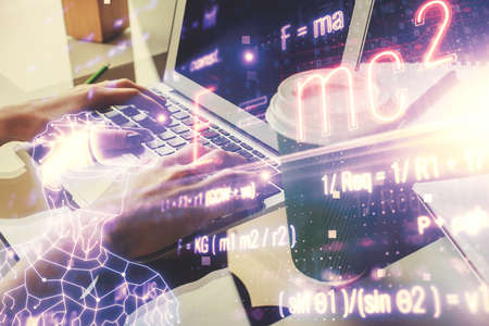 Double exposure of woman hands typing on computer and formula hologram drawing. Education concept.
