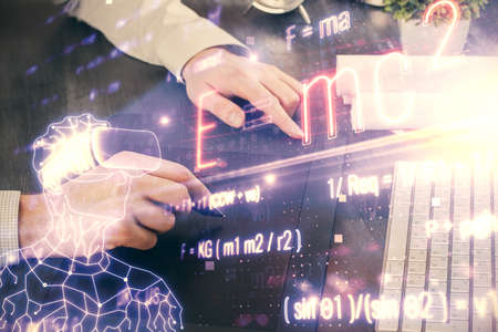 Double exposure of man's hands holding and using a phone and formulas drawing. Education concept.