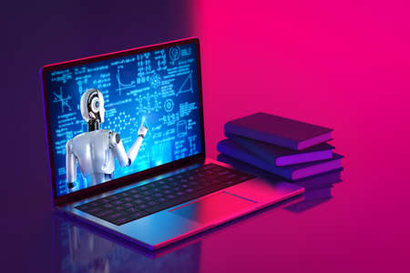 Double exposure of creative artificial Intelligence symbol with modern laptop on background. Neural networks and machine learning concept