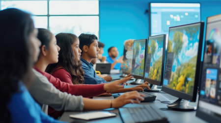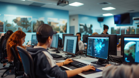 Focused students work on computers in a technology class, coding and developing software as part of their education. AIG41