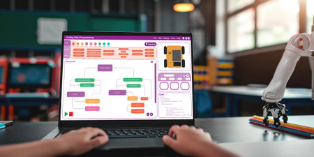 Closeup of boy using laptop programing engineering code and writing program while group of diverse kid holding controller in STEM technology classroom at blackboard written with prompt. Erudition.