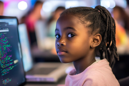 Young girl focusing on laptop screen displaying code, participating in a technology workshop for children