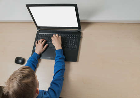 Distance education: boy solving quiz on laptop, view over the shoulder