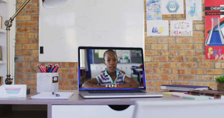 Webcam view of african american school girl on image call on laptop on table at school. distance learning online education concept