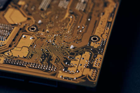 Circuit board abstract background. computer motherboard close up. modern technologies. micro elements of computer with connections and traces. Intelligent technology