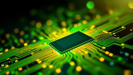 a close-up view of a circuit board background, highlighting the intricate patterns and connections of electronic circuits, evoking themes of digitalization and progress.