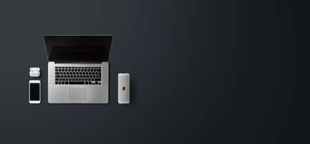 Top view of modern workplace with laptop, mobile phone, tablet and other office stuff on dark background