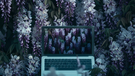 Laptop computer with purple and white wisteria flowers on screen, Generative AI illustrations.