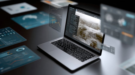 An open laptop displaying complex algorithms and data visualization surrounded by a digital workspace with interactive screens and analytical tools highlighting the role of big dat