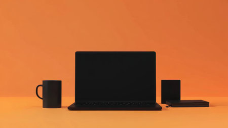 A minimalistic workspace featuring a black laptop, coffee mug, and notebook, set against a vibrant orange background, perfect for showcasing office productivity.