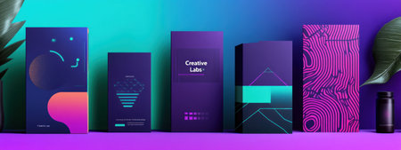 4 simple minimalistic vector designs for Creative Labs in the style of various artists, with different colors and shapes. The design set includes packaging design, branding package, and cover book design, all with a purple, blue, and green gradient background. The designs feature minimalism, architectural lines, digital network patterns, geometric block print, retro style, minimal futuristic graphic elements, and line art style, showcasing digital graphic design. --ar 8:3 --v 6.1 Job ID: f4bf7fa0-ed17-48e9-8988-f62749354da7