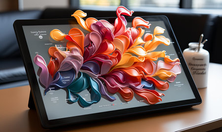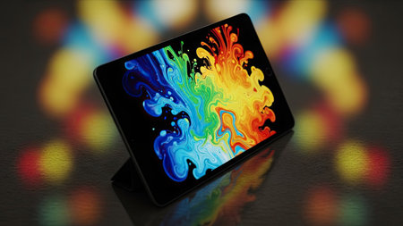 Tablet pc with abstract colorful paint splashes on a black background