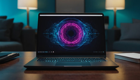A laptop showcasing vibrant digital images on its screen provides an inviting atmosphere with soft background lights, ideal for creativity and inspiration.