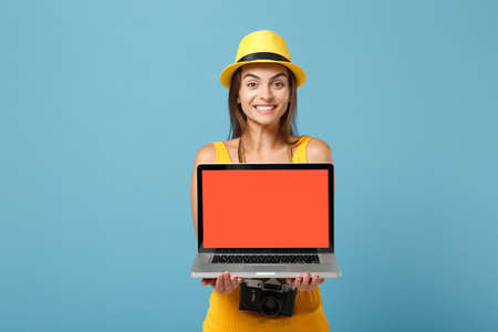 Traveler tourist woman in yellow summer clothes, hat with laptop pc computer isolated on blue background. Female passenger traveling abroad to travel on weekends getaway. Air flight journey concept.