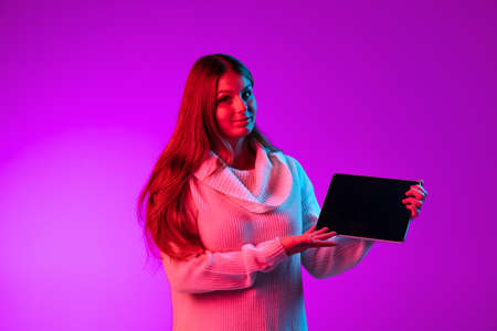 One young happy girl in warm knitted sweater using tablet, gadget isolated over purple studio background in neon light.