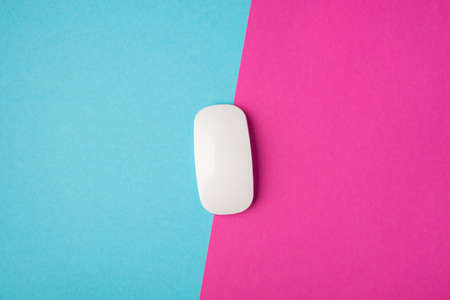 Top view photo of desktop with white mouse in the middle on isolated bicolor pink and blue background with copyspace