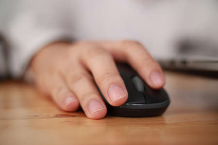 Hand using computer mouse, clicking pointer laptop pc peripheral, close up