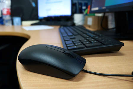 Selective focus of black wireless mouse on wooden background with copy space for text.