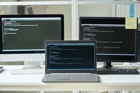 Modern computer room with high tech equipment and screens. Programming and coding concept.