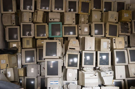 pile of old unused computers and vintage CRT monitors