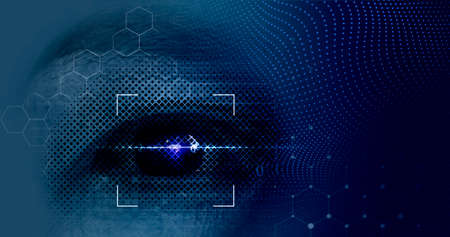 Biometric security scan. Concept of eye recognition technology. Eye with scanner and computer interface