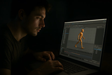 A focused young man is deeply engrossed in his work, creating a 3D animation on his laptop in a dark environment. The screen illuminates his face as he works on a walk cycle for a humanoid character model within animation software. This image captures the dedication and technical skill required for digital art, motion graphics, and game development.
