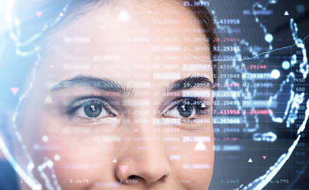 Young girl using face recognition system. Personal data information being analyzed and verified.