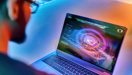 A customer interacts with a high tech laptop featuring an advanced interface and AI technology in an electronics store with dynamic lighting during