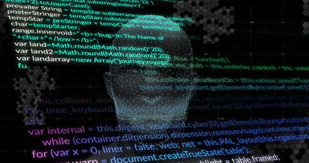 Image of digital head and data processing on black background. global technology and digital interface concept digitally generated image.