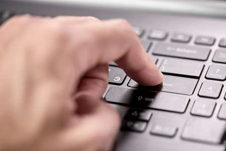 Male hand typing on laptop keyboard. Man work at home office, open notebook, close up view, selective focus.