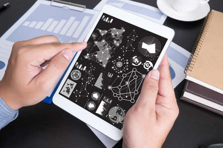 Website designer working digital tablet Modern people doing business, graphs and charts being demonstrated on the screen of a touch-pad,blank screen copy space