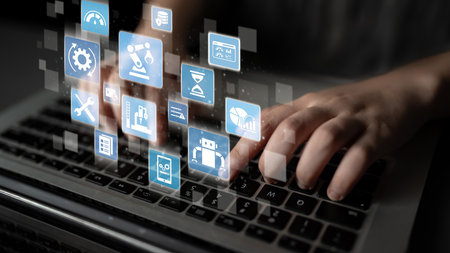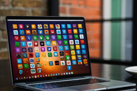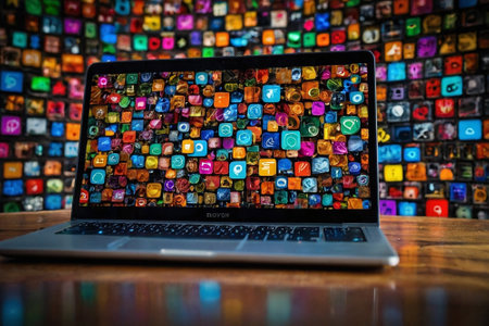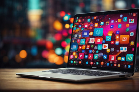 A modern laptop showcasing a vibrant digital interface with colorful icons. Ideal for concepts related to technology, business, and innovation in digital workspaces.