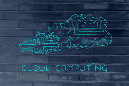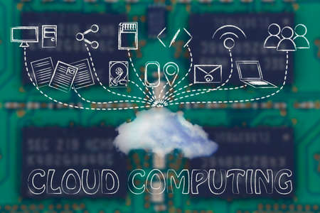 cloud computing: clouds made of electronic circuits like microchips, concept of remote online storage