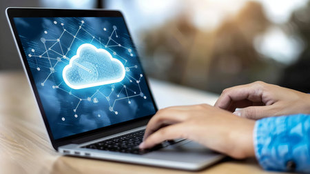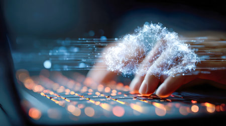 A individual engages with a glowing laptop, surrounded by an intricate digital cloud network overlay, illustrating seamless data exchange and cutting-edge technology