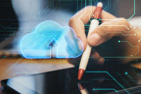 Close up of hand using digital pad with creative glowing blue cloud hologram on blurry circuit background. Upload and database concept. Double exposure