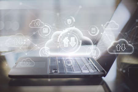 Close up of laptop on desktop with abstract glowing cloud computing hologram with download / upload arrows on blurry background. Database, technology and future concept. Double exposure