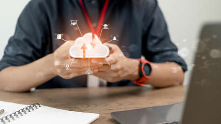 Cloud computing concept, Man hand using smartphone connect to cloud for transfer data.
