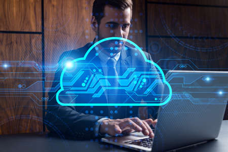 Businessman in office working with laptop technology storage cloud typing computer assemble data drawing concept. Double exposure.