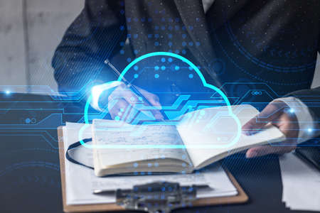 Technology cloud hologram and a woman taking notes. Multiexposure.