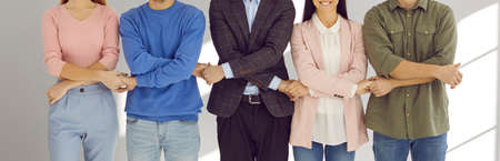 Multiracial men and women working in one company holding hands standing together in studio. Business associates, alliance, teamwork, team unity, corporate support concept. Conceptual background banner