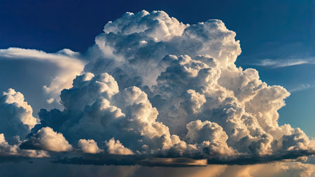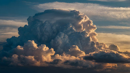 Formation showing cumulonimbus cloud formation illuminated by golden sunset light against a vibrant blue sky...