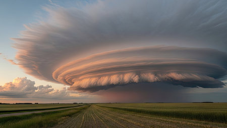 An awe-inspiring aerial view captures the immense power and dramatic beauty of a supercell thunderstorm as it churns across the rural landscape. The setting sun casts a warm, ominous glow beneath the massive, rotating cloud formation, highlighting the sheer force of nature in a moment of breathtaking spectacle.