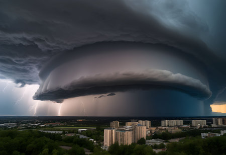 Meteorological showing dramatic dark storm clouds illuminated by bright lightning strikes across the sky keywords:...